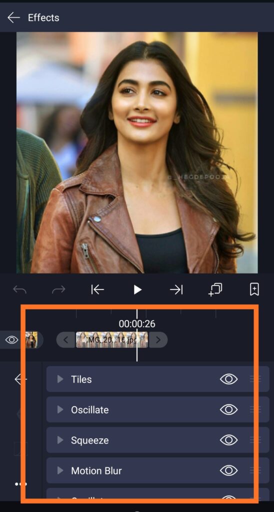 - आता या सर्व फोटोंना मी दिलेल्या shake pack मधुन shake effect copy करून add केलेल्या फोटोंना shake effect apply करून घ्यायचं आहे. (Shake effect copy करण्यासाठी तुम्हाला मी दिलेल्या project मधील photo वर click करायचा आहे, नंतर तुम्हाला इथं एक effect चा पर्याय मिळेल तर तुम्हाला तो पर्याय निवडून घ्यायचा आहे. आता तुम्ही इथं 3 बिंदू वर click करून हा effect copy करू शकता)